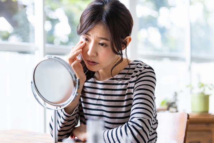 目の下のたるみは、皮膚の弾力低下や眼輪筋の衰えが原因です。眼輪筋が衰えると、眼球の位置が下がり、眼窩脂肪が押し出されて目の下のたるみとして現れます。目の下のたるみは、クマや不自然な凹みを形成する原因になるため、美容皮膚科で治療することをおすすめします。